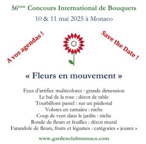 10 en 11 Mei 2025 Wedstrijd in Monaco, zie ook in “bijkomende informatie” de link naar « garden club Monaco » of https://www.gardenclubmonaco.com/monaco-concours-bouquets
