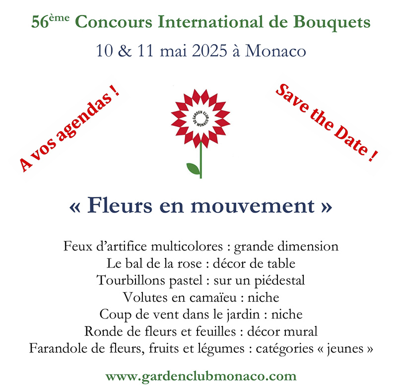 10 en 11 Mei 2025 Wedstrijd in Monaco, zie ook in “bijkomende informatie” de link naar « garden club Monaco » of https://www.gardenclubmonaco.com/monaco-concours-bouquets